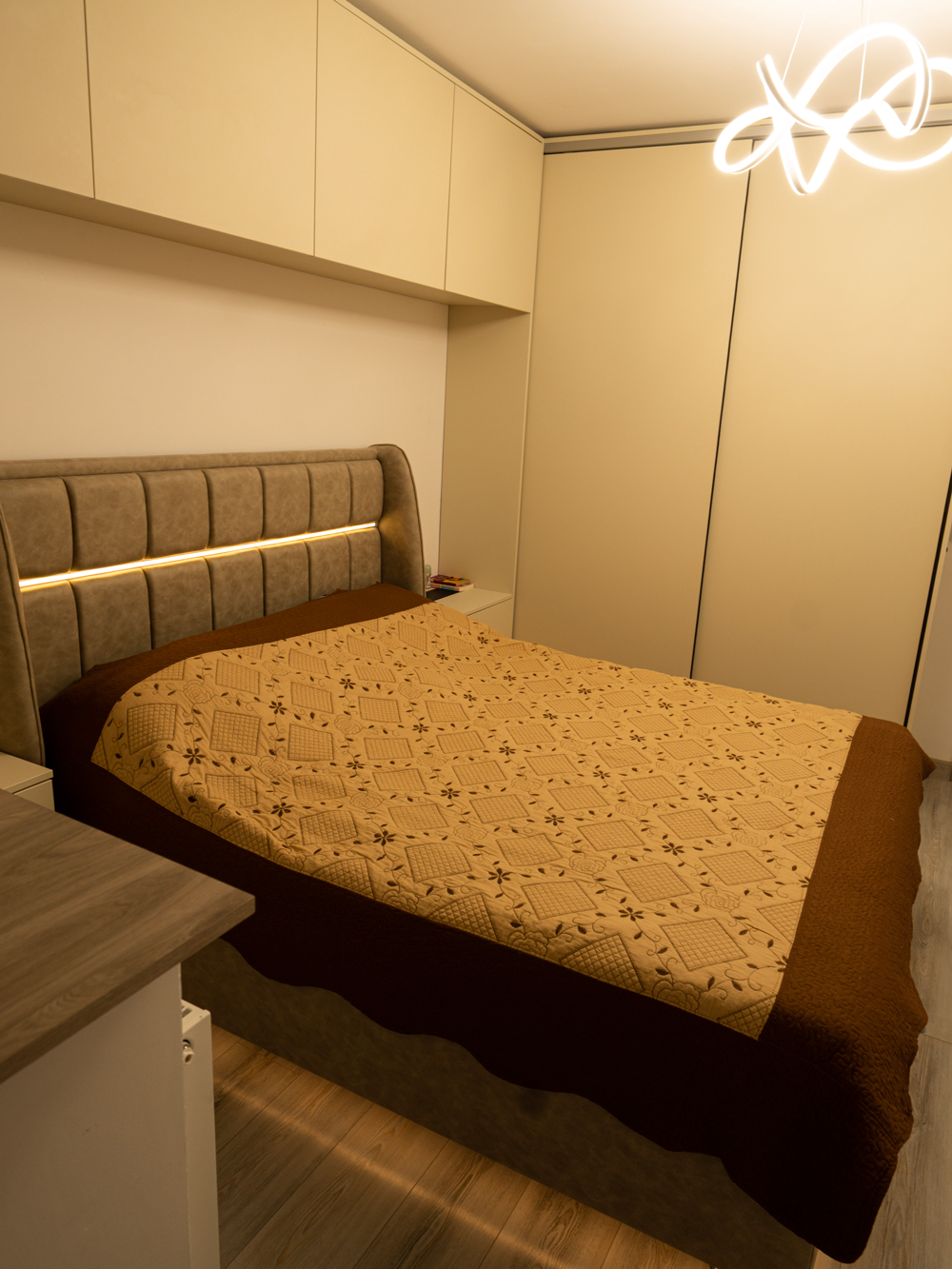 Acest dressing pe comandă cu uși glisante și LED-uri, realizat într-un apartament dintr-un bloc vechi din București, Sector 3, este un exemplu clar de mobilier gândit inteligent pentru spații reale, nu ideale. Proiectul a fost realizat pentru un cuplu tânăr, pasionat de tehnologie, care și-a dorit un dormitor aerisit, modern și funcțional.