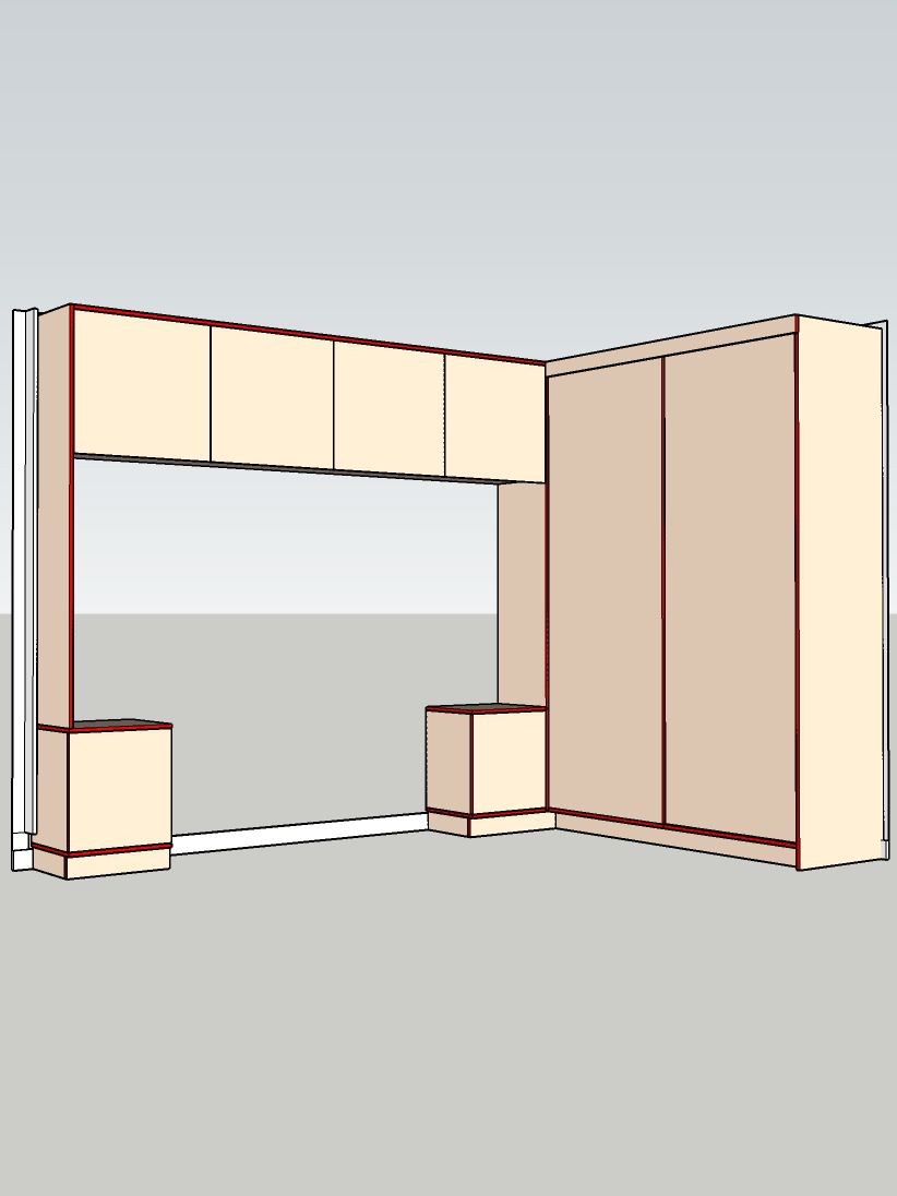 Deasupra patului a fost realizat un corp suspendat cu 4 uși, care se deschid în sus. Această soluție oferă: