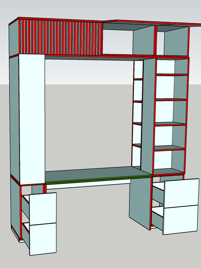 Biroul este integrat în ansamblul mobilierului și realizat până în tavan, ceea ce oferă: